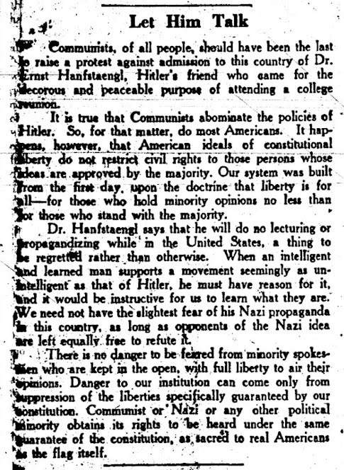 It would also stand in stark contrast to the Courier's 1934 appeal to Communists and other left-wing radicals to stop protesting over Nazi speech. They admonished the far-left to let Nazis speak and to stand up for their free speech rights two years after they happily cheered local vigilance committees cracking down on them. Even just their potential radical whispers: