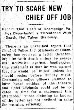 The mention of a previous cross burning put this on my list of items to follow up on. It turns out J. J. Michaels was not another Black person being threatened by local Klan members in yet another "unauthorized" cross burning. He was a white former Police Chief for the City of Champaign (and failed Champaign County Sheriff candidate in 1914). Earlier Urbana Daily Courier articles paint him as an early enforcer of liquor restrictions before federal prohibition, to local annoyance and threats. From the Courier on 8/15 and 10/24/1914: